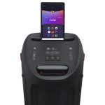 • کنترل از طریق برنامه JBL PartyBox: تنظیم رنگ‌ها و حالت‌های نورپردازی، پخش موسیقی و مدیریت تنظیمات صدا از طریق برنامه موبایل.